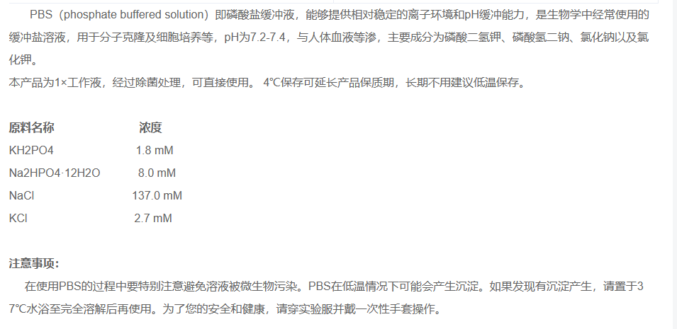 在使用PBS的过程中要特别注意避免溶液被微生物污染。PBS在低温情况下可能会产生沉淀。如果发现有沉淀产生,请置于37℃水浴至完全溶解后再使用。为了您的安全和健康,请穿实验服并戴一次性手套操作。